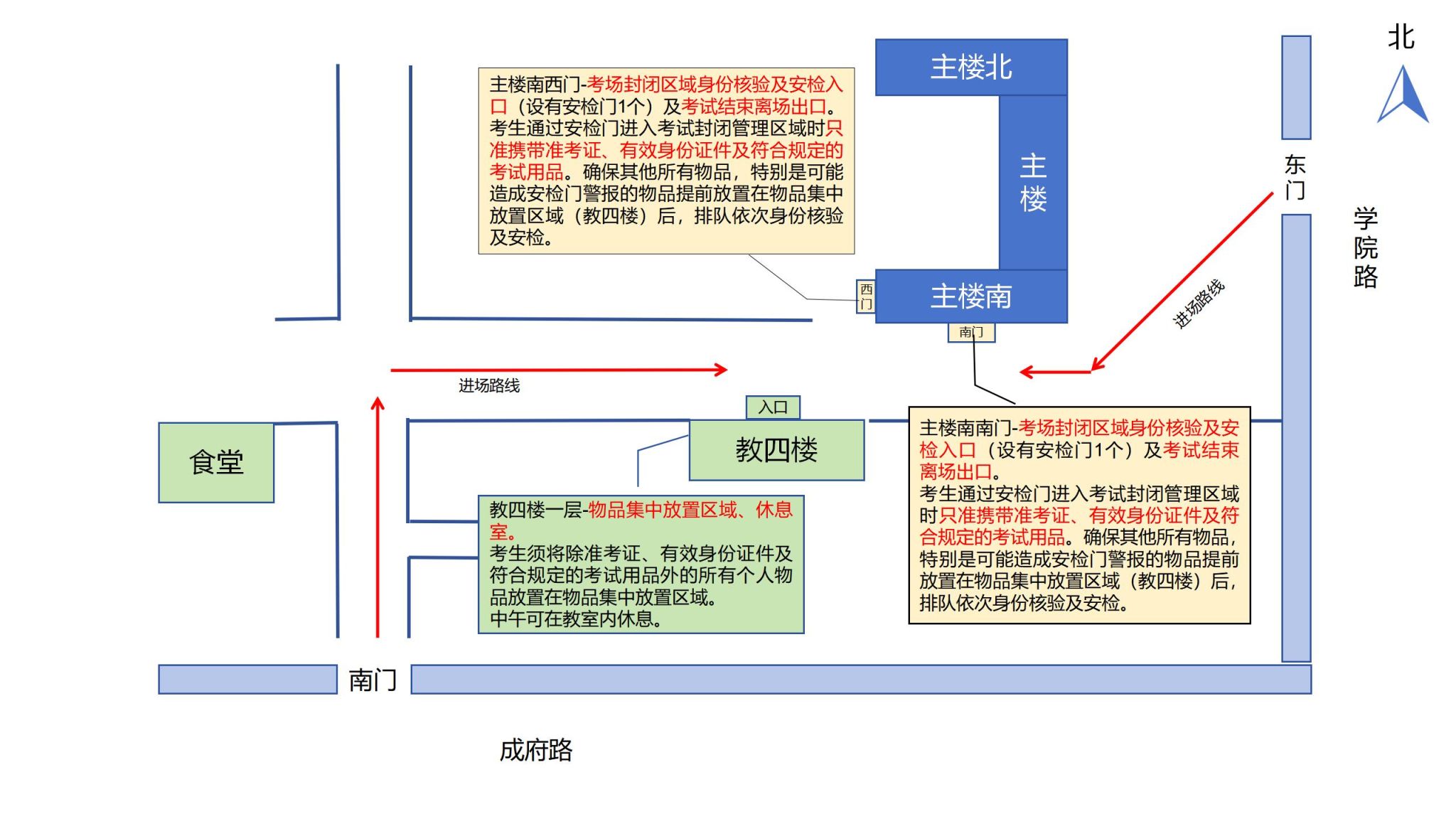 我考点进入主楼南考试封闭区域设置西门、南门2个入口,考生可自行选择入口,有序排队安检。如遇异常情况,请听从工作人员指挥,配合复检工作,入口安排见图2