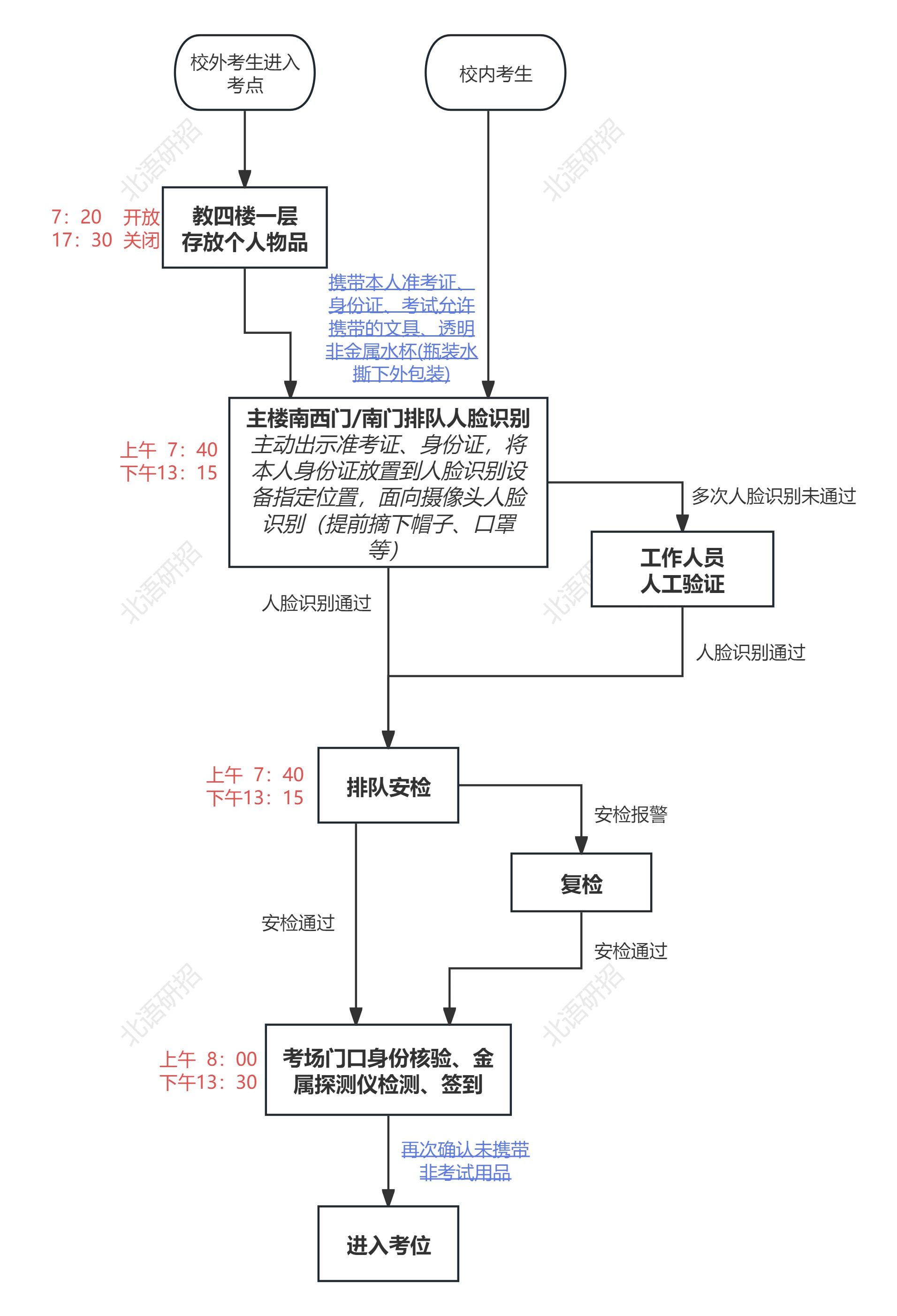 进入考场-身份核验、金属探测仪检测、签到 | 主楼南各考场教室 | 8:00起 | 13:30起 |
